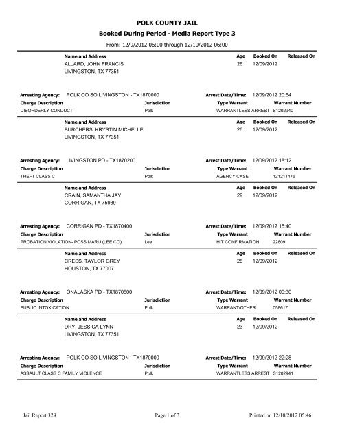 8313 5786 W W M M Race Race Sex Sex Process Date Time Process Date Time 12172017. View the most recent booking and release report. POLK COUNTY JAIL Booked During Period - Media Report - Type 3 With Photo Age Booked On Released On RULE RICK EDWARD 56 LIVINGSTON TX 77351 02212021 Name and Address Arresting Agency.